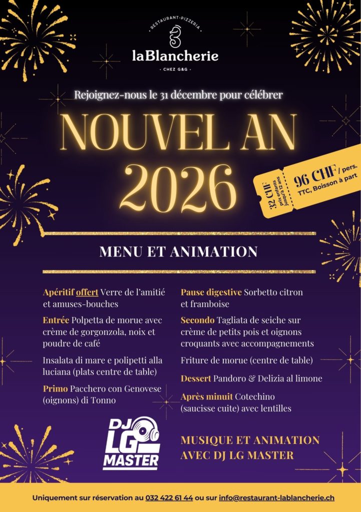 Un Menu gourmand et une animation musicale live avec DJ LG Master vous attendent pour finir l’année en beauté ! Réservez votre table au 032 422 61 44 ou par mail à info@restautant-lablancherie.ch